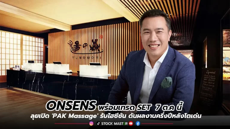 ONSENS เปิดเทรดวันแรกคึกคัก เหนือจอง 26.83% ตอกย้ำหุ้นเมกะเทรนด์สุขภาพ เติบโตมั่นคง สร้างผลตอบแทนดี เดินหน้าขยายสาขาแบรนด์ KLAI และ PAK Massage รวม 7 แห่ง พร้อมเปิดสาขา Flagship ใหม่ในโครงการ Social Wellness Hotel & Spa ใน 3 ปี FSS ที่ปรึกษาทางการเงินเผยหลังระดมทุนฐานะการเงินแกร่ง ธุรกิจโดดเด่นต่อเนื่อง ศักยภาพการแข่งขันสูง