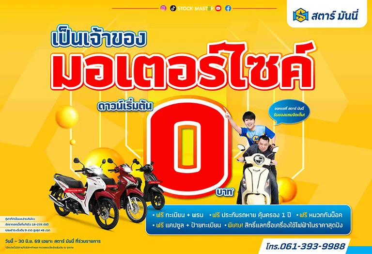 บมจ.สตาร์ มันนี่ (STARM) สะเทือนวงการสองล้อกับแคมเปญสุดปัง! ออกรถมอเตอร์ไซค์ใหม่ที่ สตาร์ มันนี่ จ่ายดาวน์เริ่มต้น 0 บาท* ผ่อนสบายสูงสุด 48 เดือน* พร้อมจัดเต็มของแถมแบบไม่ยั้ง