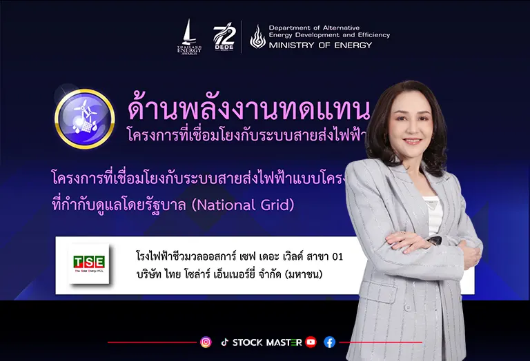 สำหรับการประกวด Thailand Energy Awards 2025 ซึ่งในปีนี้ บมจ.ไทย โซล่าร์ เอ็นเนอร์ยี่ (TSE) ก็ได้คว้ารางวัล “ดีเด่น”จากโครงการโรงไฟฟ้าชีวมวล “ออสการ์ เซฟ เดอะ เวิลด์ 1” อีก 1 แห่ง ในด้านพลังงานทดแทน ซึ่งเป็นการประกวดผลงาน/ โครงการที่เกี่ยวข้องกับการผลิตการใช้พลังงานทางเลือก (Alternative Energy) ทุกชนิดที่นำมาใช้ทดแทนน้ำมันปิโตรเลียมหรือเชื้อเพลิงฟอสซิล โดยมุ่งเน้นพลังงานทดแทน (Renewable Energy) ที่สามารถหมุนเวียนกลับมาใช้ใหม่ได้ในระยะเวลาสั้นๆ อาทิ พลังงานแสงอาทิตย์ พลังงานลม พลังงานความร้อนใต้พิภพ พลังงานคลื่น ชีวมวล วัสดุเหลือใช้ทางการเกษตร เชื้อเพลิงจากขยะชุมชน (Municipal Solid Waste ; MSW) เชื้อเพลิงชีวภาพ (เช่น ก๊าซชีวภาพ ไบโอดีเซล และเอทานอล) เชื้อเพลิงไฮโดรเจน รวมถึงของเสียจากภาคอุตสาหกรรม ฯลฯ ณ 31 มีนาคม 2025 กลุ่มบริษัทฯ มีโครงการที่ดำเนินการอยู่รวมทั้งสิ้น 62 โครงการ กำลังการผลิตเสนอขายรวม 382.86 เมกะวัตต์ โดยแบ่งเป็นโครงการที่เปิดดำเนินการเชิงพาณิชย์ (COD) แล้ว 34 โครงการ รวม 153.8 เมกะวัตต์ และโครงการที่อยู่ในระหว่างการพัฒนาจากการได้รับคัดเลือกในโครงการ Solar Big Lot Phase 1 และ 2 จำนวน 28 โครงการ รวม 229.06 เมกะวัตต์ และมีกำหนดการจำหน่ายไฟฟ้าเชิงพาณิชย์ระหว่างปี 2027-2030