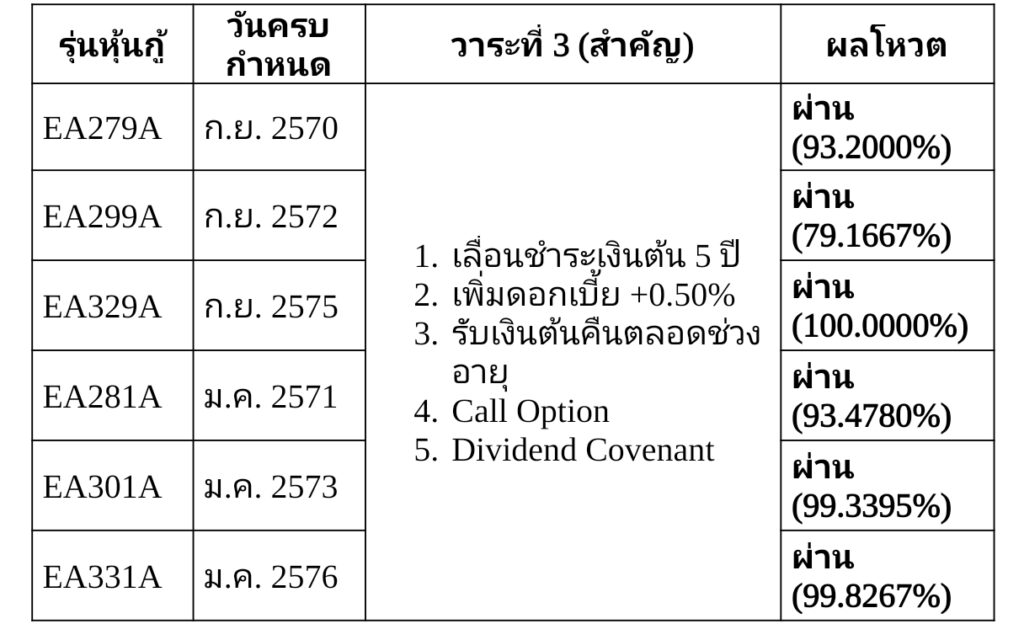 สำหรับหุ้นกู้ทั้ง 9 รุ่นที่ได้รับการอนุมัติในวันนี้ ประกอบด้วย 6 รุ่นใหม่ที่ได้รับเสียงสนับสนุนในที่ประชุมวันที่ 9 กรกฎาคม และ อีก 3 รุ่นที่ได้รับอนุมัติไปแล้วในการประชุมรอบก่อนเมื่อวันที่ 27 มิถุนายนที่ผ่านมา โดยทั้ง 9 รุ่นนี้ ต่างได้รับข้อเสนอฉบับปรับปรุง ซึ่งกำหนดให้มีการขยายระยะเวลาไถ่ถอนออกไปเพียง 5 ปี เท่ากันทั้งหมด เพื่อให้เกิดความชัดเจนและเป็นธรรมระหว่างทุกรุ่น ทั้งนี้มีเพียงรุ่น EA257A ที่ยังคงพิจารณารับข้อเสนอเดิมโดยยังคงขอขยายระยะเวลาไถ่ถอนออกไป 7 ปี ซึ่งแตกต่างจากข้อเสนอใหม่ที่ได้รับการเห็นชอบจากผู้ถือหุ้นกู้ส่วนใหญ่ในวันนี้