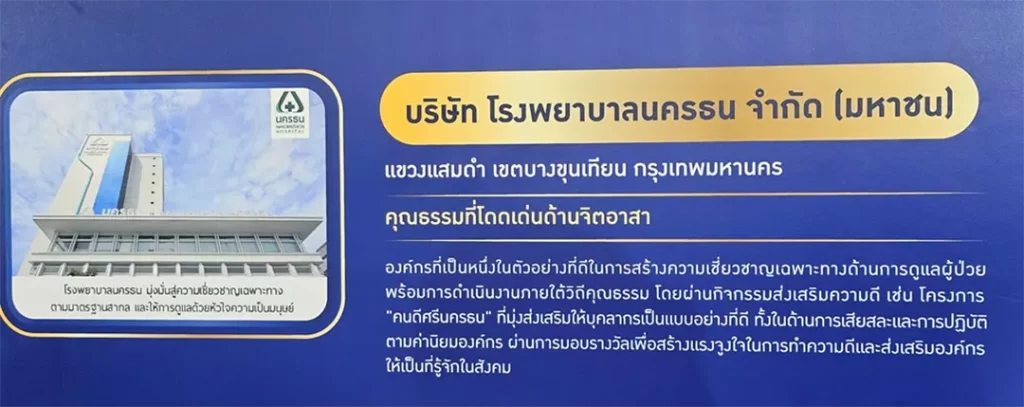 โดย บริษัท โรงพยาบาลนครธน จำกัด (มหาชน) (NKT) ได้รับรางวัลในฐานะองค์กรที่มีคุณธรรมโดดเด่นด้านจิตอาสา เป็นหนึ่งในตัวอย่างที่ดีในการสร้างความเชี่ยวชาญเฉพาะทาง ด้านการดูแลผู้ป่วยพร้อมการดำเนินงานภายใต้วิถีคุณธรรม โดยผ่านกิจกรรมส่งเสริมความดีต่างๆ อาทิ ‘โครงการขยะกำพร้า’ ที่เชิญชวนชาวชุมชนในย่านพระราม 2 แยกขยะและนัดส่งขยะ เพื่อนำไปเป็นเชื้อเพลิงผลิตไฟฟ้า เป็นประจำทุกเดือนโดยเจ้าหน้าที่ของโรงพยาบาลร่วมเป็นจิตอาสาขับเคลื่อนกิจกรรม ‘โครงการคนดีศรีนครธน’ ที่มุ่งส่งเสริมบุคลากรเป็นแบบอย่างที่ดี ทั้งในด้านการเสียสละและการปฏิบัติตามค่านิยมองค์กร ผ่านการมอบรางวัลเพื่อสร้างแรงจูงใจในการทำความดี และส่งเสริมองค์กรให้เป็นที่รู้จักในสังคม