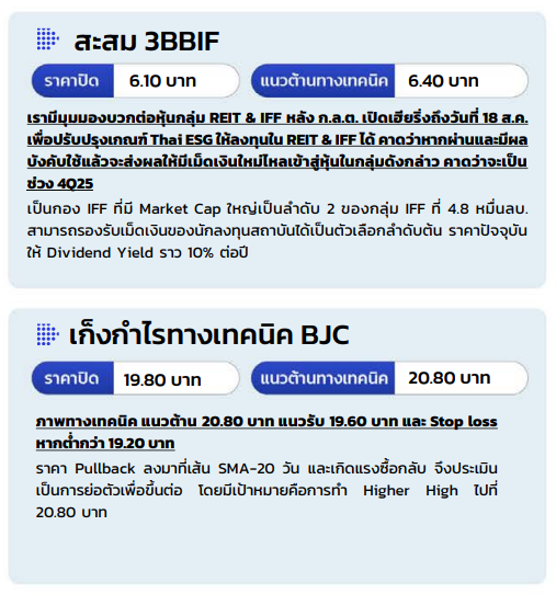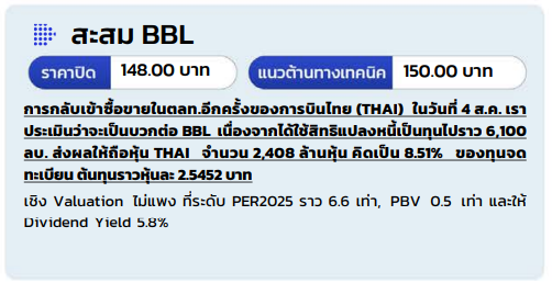 ต่างชาติยังซื้อหุ้นไทย แม้มีปัจจัยลบเฉพาะตัว วานนี้ นักลงทุนต่างชาติยังคงซื้อสุทธิในตลาดหุ้นไทยต่อเนื่องเป็นวันที่ 7 แม้มีประเด็นความขัดแย้งในเขตชายแดนกัมพู ชา แต่เราคาดว่านักลงทุนต่างชาติยังคงคาดหวังต่อนโยบายภาษีที่สหรัฐฯ ประกาศต่อไทย ซึ่งมีคาดการณ์ว่าจะได้ใกล้เคียงกับประเทศในภูมิภาคในระดับ 18-20% นอกจากนี้เรามองว่าระดับเงินปันผลคาดการณ์สำหรับผลประกอบการรอบครึ่งปีของไทยก็ยังอยู่ในระดับที่น่าสนใจ ซึ่งบริษัทจดทะเบียนส่วนใหญ่จะขึ้นเครื่องหมาย XD ในช่วงเดือน ส.ค. – ก.ย. เราจึงคาดเป็นอีกปัจจัยหนุนการไหลเข้าของ Fund Flow ทั้งนี้แม้ตลาดยังมองบวกและเก็งกำไรต่อการประกาศภาษี แต่เราแนะนำ ระมัดระวังกลุ่มที่อาจจะได้รับผลกระทบเช่นฟาร์มสัตว์บกที่อาจเผชิญกับการแข่งขันที่สูงขึ้น หากไทยยอมรับเงื่อนไขทางภาษีและหนุนให้การน าเข้าเนื้อสัตว์จากสหรัฐฯ ทำได้ง่ายขึ้น