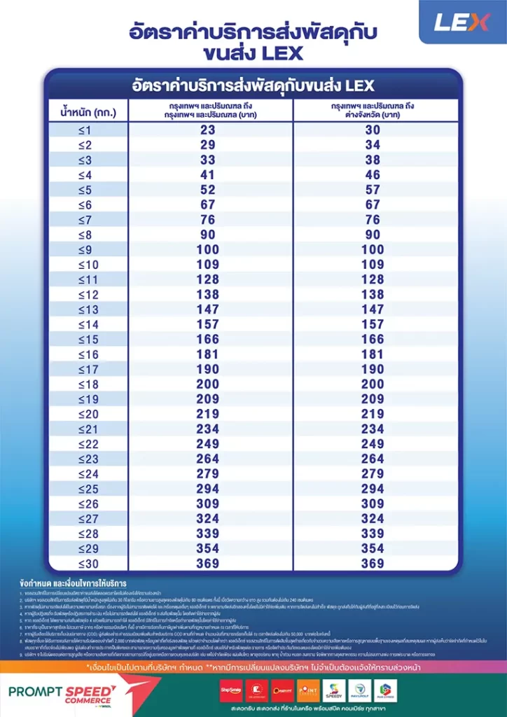 1. บริการจัดส่งพัสดุภายใน 1 – 3 วัน ในอัตราค่าบริการเริ่มต้นเพียง 23 บาท รองรับน้ำหนักได้สูงสุด 30 กก. และความยาวของกล่องรวมกันไม่เกิน 240 ซม.