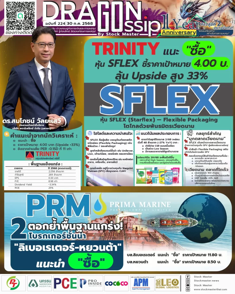 1 ) TRINITY แนะ “ซื้อ” หุ้น SFLEX ชี้ราคาเป้าหมาย 4.00 บาท ลุ้น Upside สูง 33%