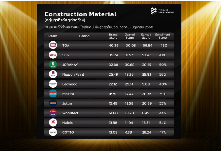 ที่ทำผลงานยอดเยี่ยมในกลุ่มธุรกิจวัสดุก่อสร้าง (Construction Material) บนสื่อโซเชียลมีเดียอย่างมีประสิทธิภาพสูงสุด ประจำครึ่งปีแรก 2568 (เดือนมกราคม – มิถุนายน 2568) จัดโดย Thailand Social Awards