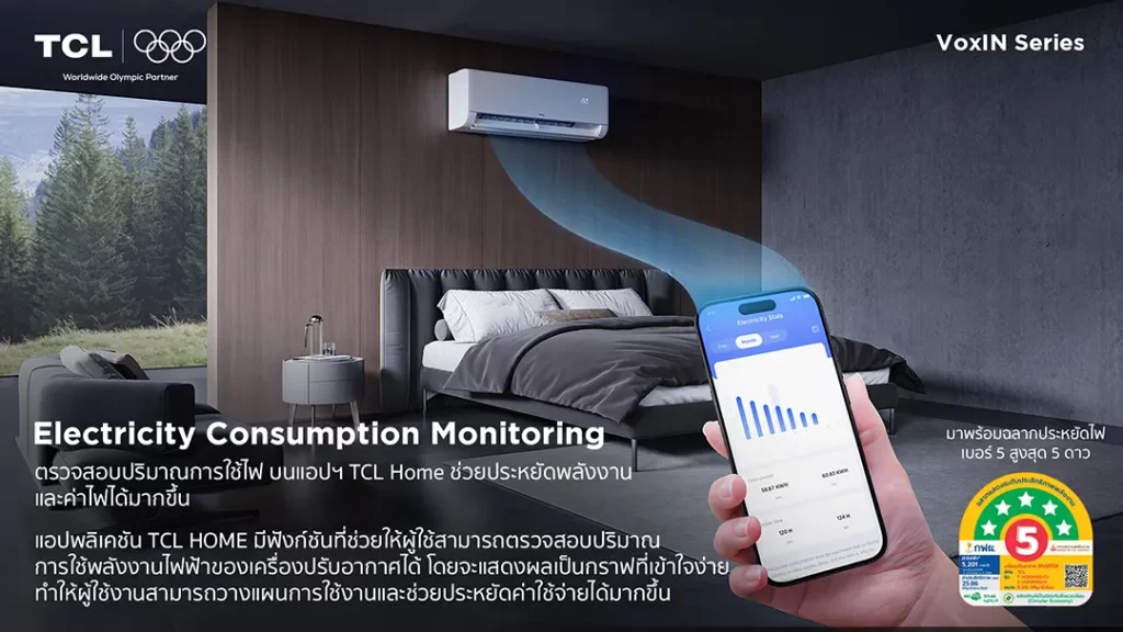 ทั้งนี้ เพื่อตอกย้ำความเป็นผู้นำด้านเทคโนโลยีและตอบสนองความต้องการของผู้บริโภคที่เปลี่ยนแปลงไป TCL เปิดตัว VoxIN Series เครื่องปรับอากาศรุ่นใหม่ สามารถสั่งการด้วยเสียงอัจฉริยะด้วยระบบ Voice Control สามารถสั่งการด้วยเสียงโดยตรงกับเครื่องปรับอากาศ แบบไม่ต้องพึ่งพาอุปกรณ์เสริม ที่มาพร้อมนวัตกรรมเทคโนโลยีล้ำสมัย และการควบคุมพลังงานขั้นสูง สุดล้ำด้วย Smart Energy Saving การประหยัดพลังงานอัจฉริยะ T-AI Energy Saving ระบบ AI ที่ปรับการทำงานของคอมเพรสเซอร์ได้อย่างแม่นยำ เพื่อรักษาอุณหภูมิให้สม่ำเสมอและประหยัดพลังงานได้สูงสุดถึง 37% พร้อมด้วย Generator Mode โหมดลดการใช้พลังงาน 3 ระดับ ช่วยควบคุมกระแสไฟฟ้าและปรับแต่งการใช้พลังงานได้อย่างมีประสิทธิภาพ Electricity Consumption Monitoring ตรวจสอบการใช้ไฟฟ้าแบบเรียลไทม์ผ่านแอปฯ TCL HOME ช่วยให้ผู้ใช้งานสามารถติดตามและปรับการใช้งานเครื่องปรับอากาศ เพื่อเพิ่มประสิทธิภาพการประหยัดพลังงานและค่าใช้จ่าย