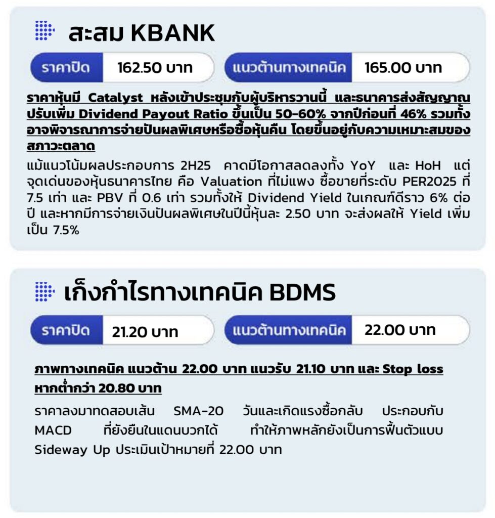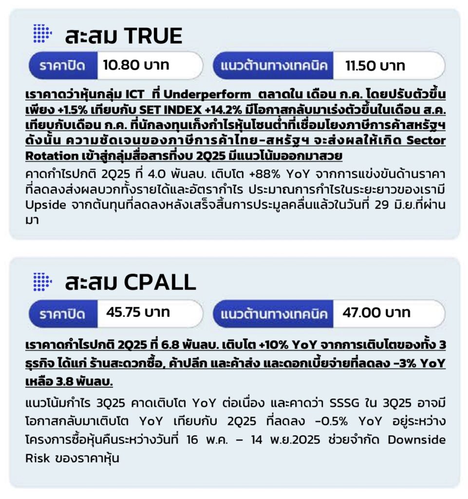 ขับเคลื่อน SET Index สืบเนื่องจากการรายงานตัวเลขเศรษฐกิจที่เบาบางทั้งในและต่างประเทศตลอดทั้งสัปดาห์ เราประเมินเป็นโอกาสที่ดีในการจับจังหวะเก็งกําไรการรายงานผลประกอบการ โดยกลุ่มหุ้นที่คาดกําไร 2025 เติบโตเด่นได้แก่ ค้าปลีก, F&B, ไฟแนนซ์,รับเหมาก่อสร้าง และ สื่อสาร