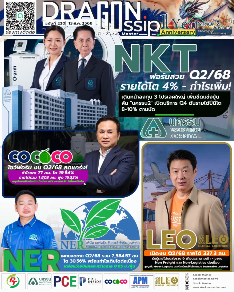 1 ) NKT ฟอร์มสวย Q2/68 รายได้โต 4% – กำไรเพิ่ม เดินหน้าลงทุน 3 โปรเจคใหญ่ เพิ่มขีดแข่งขัน ลั่น “นครธน2” เปิดบริการ Q4 ดันรายได้ปีนี้โต 8-10% ตามนัด