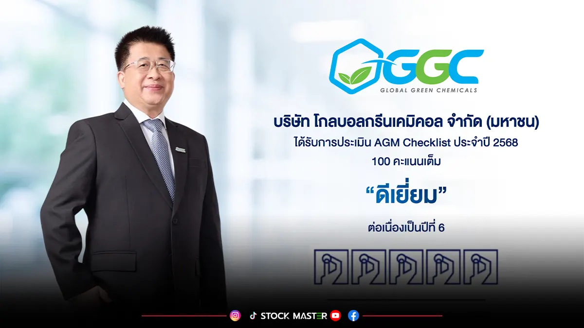บริษัท โกลบอลกรีนเคมิคอล จำกัด (มหาชน) หรือ GGC ได้รับคะแนนการประเมินคุณภาพการจัดประชุมสามัญผู้ถือหุ้น (AGM Checklist) ประจำปี 2568 ในระดับ “ดีเยี่ยมสมควรเป็นตัวอย่าง” (5 เหรียญ) ด้วยคะแนนเต็ม 100 คะแนน จากสมาคมส่งเสริมผู้ลงทุนไทย