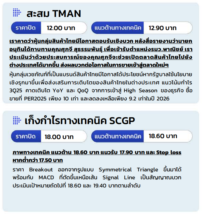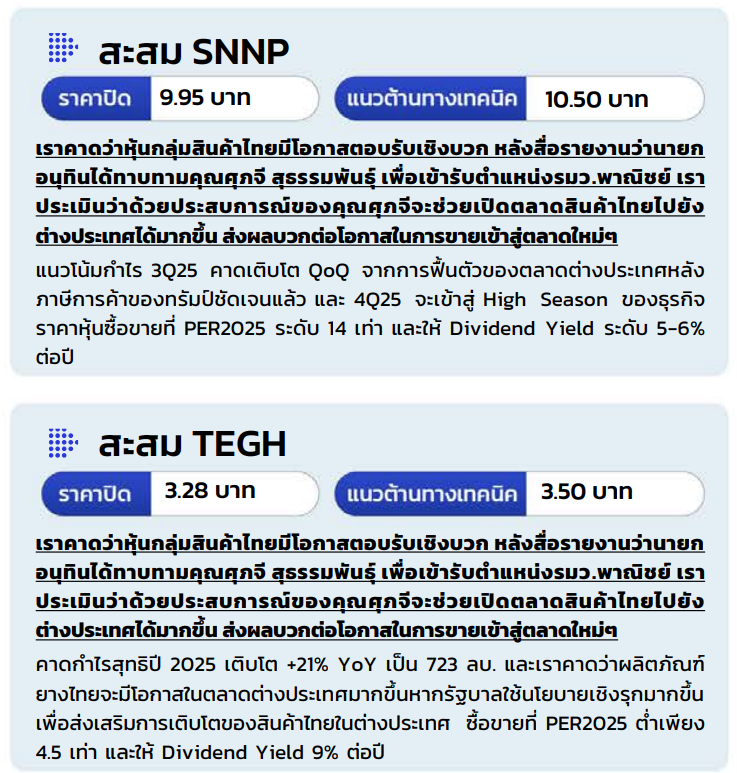 แต่ด้วยกาปรับตัวขึ้นของหุ้นขนาดใหญ่ที่ร้อนแรงตังแต่สัปดาห์ที่แล้ว แนะนําสลับมาเก็งกําไรหุ้นขนาตกลาง-เล็ก ที่ยัง Laggard และควรได้อานิสงส์เชิงบวกจากมาตรการกระตุ้นการบริโภคภายในประเทศ