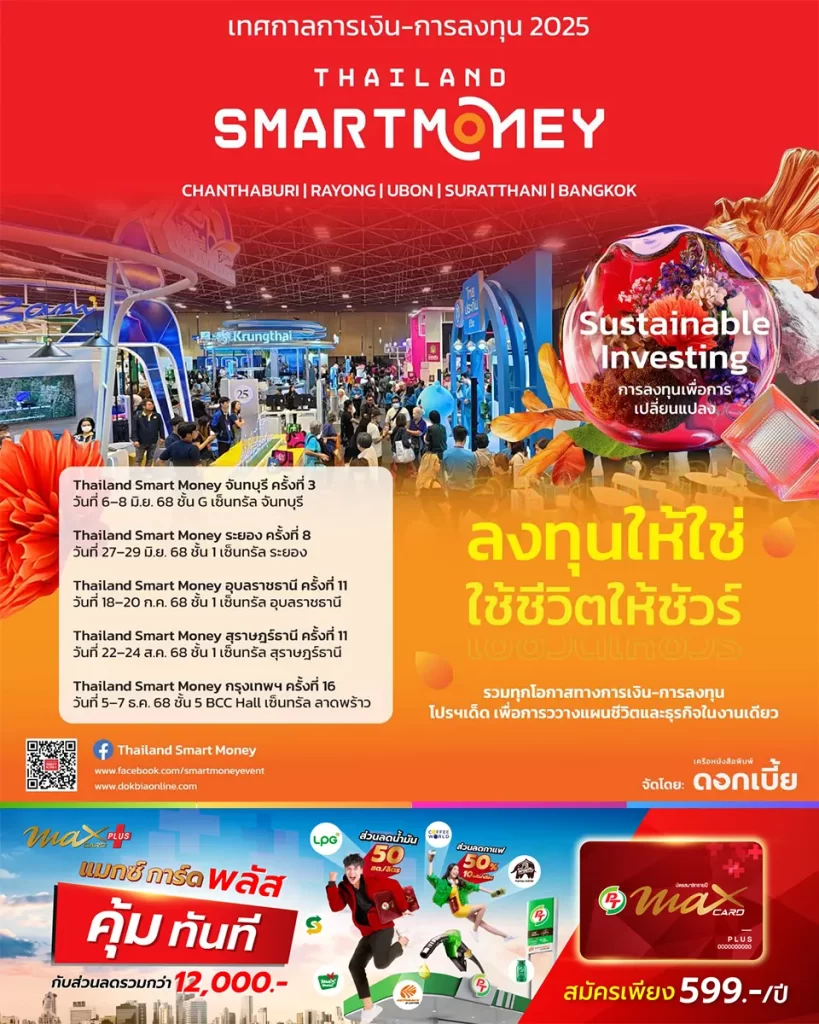 ทั้งนี้ การเดินสาย 4 จังหวัดถือเป็นการนำร่องสู่การจัดงานใหญ่ส่งท้ายปี “Thailand Smart Money 2025 กรุงเทพฯ” ภายใต้แนวคิด “Sustainable Investing: การลงทุนเพื่อการเปลี่ยนแปลง” ซึ่งจะจัดขึ้นระหว่าง วันที่ 5-7 ธันวาคม BCC Hall ชั้น 5 เซ็นทรัลลาดพร้าว โดยงานดังกล่าวจะเป็นศูนย์รวมสถาบันการเงินชั้นนำและบริการด้านการลงทุนไว้อย่างครบวงจร พร้อมกิจกรรมเสวนาพิเศษและสิทธิประโยชน์ทางการเงินที่จะตอบสนองความต้องการของผู้เข้าร่วมงานได้อย่างรอบด้าน