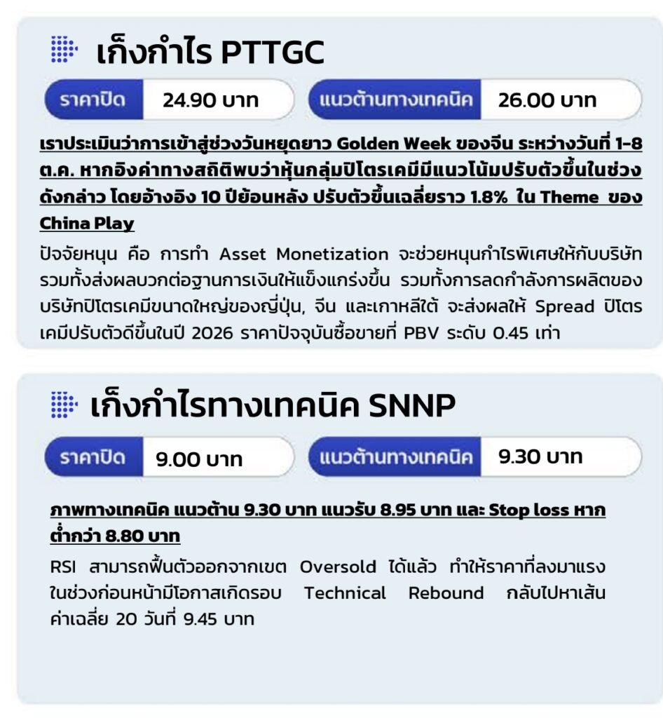 แนะนําสลับไปหุ้น Defensive เพื่อรอคาด SET Index ทําฐานบริเวณแนวรับ 1,268 จุด คาดการอ่อนค่าของสกุลเงินบาทอาจเป็นแรงกดดันต่อแนวโน้มกระแสเงินทุนต่างชาติให้ชะลอตัวในระยะสั้น ขณะที่ปัจจัยเชิงเทคนิคสะท้อนแนวรับสําคัญคือ Low ในช่วงสัปดาห์ก่อนหน้าที่1,268 จุด เชิงกลยุทธ์ แนะนําทํา Sector rotation ไปพักเงินในหุ้นกลุ่ม Defensive เช่น สื่อสาร และ REITs & IFFs เพื่อรอยืนยันการฟื้นตัวของ SET Index ก่อนเข้าเพิ่มน้ําหนักอีกครั้ง