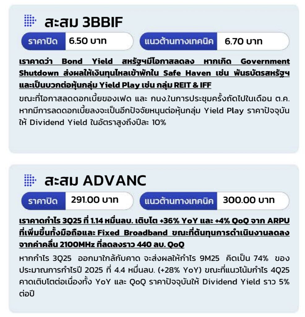 แนะนําติดตามแนวรับที่ 1,268 จุด ประเมินกรอบการเคลื่อนไหวของ SET Index วันนี้ที่ 1.268-1,280 จุด นอกเหนือจากเงินบาททีอ่อนค่าจะส่งผลกระทบเชิงลบต่อแนวโน้มการไหลเวียนของกระแสเงินทุนต่างชาติ เราประเมินนักลงทุนสถาบันต่างชาติอาจมีการปรับสถานะการถือครองสินทรัพย์เสี่ยงเพื่อรอติดตามความเสี่ยงของ ‘Government Shutdown’