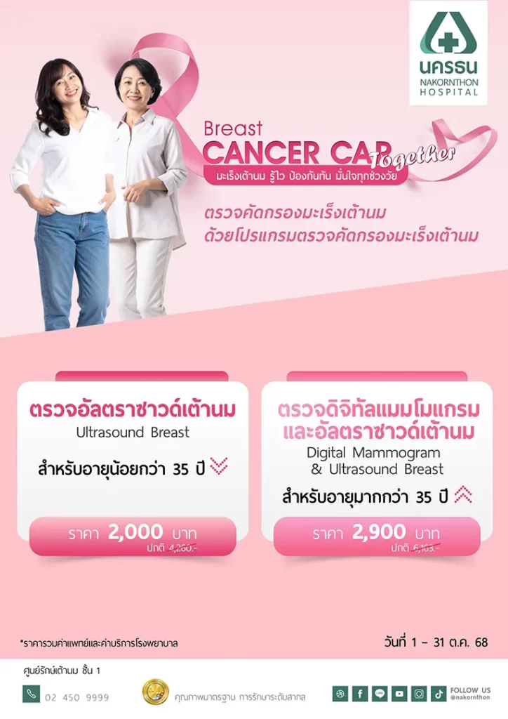 2. ตรวจด้วยเครื่องดิจิทัลแมมโมแกรมและอัลตราซาวด์เต้านม ราคา 2,900 บาท เปิดให้สั่งซื้อผ่านเว็บไซต์ www.nakornthon.com ตั้งแต่วันที่ 1 – 31 ตุลาคม 2568