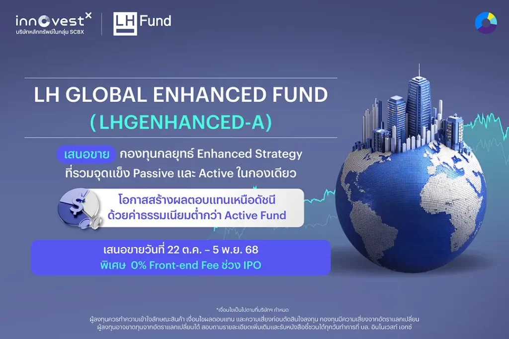 จับมือ บริษัทหลักทรัพย์จัดการกองทุน แลนด์ แอนด์ เฮ้าส์ จำกัด (LH Fund) เปิดตัว กองทุน LH Global Enhanced Fund หรือ “LHGENHANCED-A” กองทุนกลยุทธ์ Enhanced Strategy ที่รวมจุดแข็งของกองทุน Passive และ Active ไว้ในกองเดียว เพื่อสร้างสมดุลระหว่างความมั่นคงและโอกาสเติบโต จากการกระจายลงทุนในหุ้นทั่วโลก พร้อมสร้างผลตอบแทนส่วนเสริมผ่าน Mega Trend โลก เช่น AI Ecosystems, Quantum Technology, Space Economy/Defense และ Nuclear Energy การเปิดตัวกองทุนครั้งนี้สะท้อนจุดยืนของ InnovestX ในการเป็น ผู้นำด้านนวัตกรรมการลงทุน ที่นำเสนอทางเลือกการลงทุนร่วมกับพันธมิตรชั้นนำ เพื่อตอบโจทย์นักลงทุนไทยยุคใหม่ที่ต้องการทั้งความมั่นคง ผลตอบแทน และค่าธรรมเนียมที่เหมาะสม เสนอขาย (IPO) ช่วงวันที่ 22 ตุลาคม – 5 พฤศจิกายน 2568 พร้อมโปรโมชัน ฟรีค่าธรรมเนียมการขาย (Front-end fee) สำหรับจองซื้อได้เฉพาะผ่าน แพลตฟอร์ม InnovestX เท่านั้น