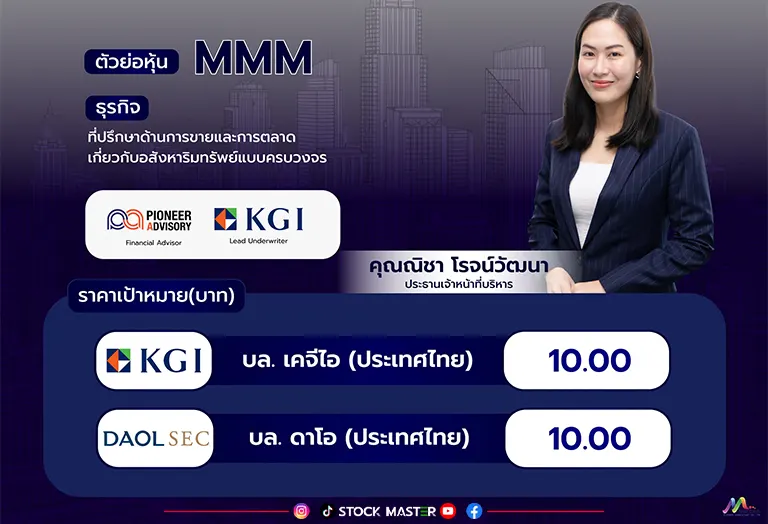 บมจ.เอ็มเอ็มเอ็ม แคปปิตอล “MMM” ประกาศตอกย้ำ Business Model ในการเป็น “โบรกเกอร์ อสังหาริมทรัพย์”แบบครบวงจร ภายใต้จุดเด่นในการวางตำแหน่งของบริษัทฯ เป็น “มินิมาร์ทอสังหาริมทรัพย์” พร้อมนำร่องรายแรกจากตลาด LiVEx สู่ตลาดหลักทรัพย์ mai เล็ง ระดมทุนขยายพอร์ตธุรกิจ 3 BU เร่งต่อยอดการเติบโตในอนาคต ด้าน บล.เคจีไอ -บล.ดาโอ สแกนหุ้น น้องใหม่ “MMM” เคาะราคาเป้าหมาย 10.00 บาท/หุ้น