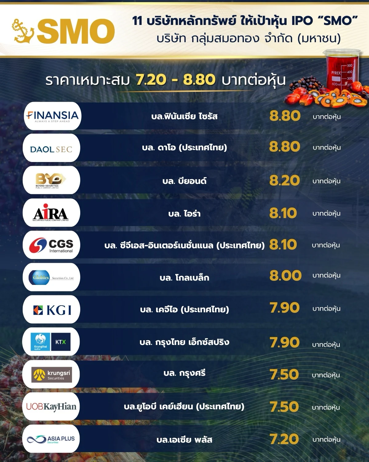 บริษัทหลักทรัพย์ 11 แห่ง วิเคราะห์ราคาเหมาะสมหุ้น IPO “กลุ่มสมอทอง” สูงสุดที่ 8.80 บาท ประเมินฐานะการเงินแกร่ง ระดมทุนเสริมศักยภาพการผลิต รับกระแสการส่งออก CPO ขาขึ้น หนุนกำไรโตต่อเนื่อง