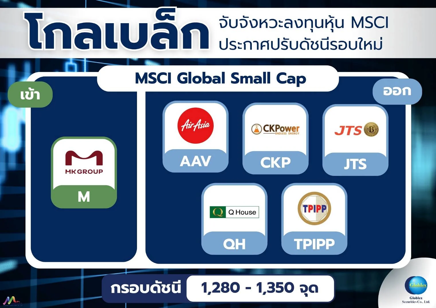 นายวัชเรนทร์ จงยรรยง ผู้อำนวยการฝ่ายวิจัย บล.โกลเบล็ก แนะนำกลยุทธ์การลงทุนในหุ้นที่ปรับอานสิสงส์จากการ MSCI ประกาศรายชื่อหุ้นที่มีการปรับน้ำหนักในดัชนีรอบใหม่ ซึ่งจะมีผลในวันที่ 24 พฤศจิกายน 2568 โดยในรอบนี้ไม่มีการเปลี่ยนแปลงในดัชนี MSCI Thailand Index ขณะที่ดัชนี MSCI Global Small Cap มีการเปลี่ยนแปลงสำคัญ โดยหุ้นที่มีการนำเข้าคำนวณได้แก่ M ส่วนหุ้นที่นำออกจากการคำนวนดัชนี ได้แก่ AAV, CKP, JTS, QH, TPIPP ซึ่งส่งผลให้มีแรงซื้อเก็งกำไรหุ้นที่จะปรับเข้า และระวังแรงขายหุ้นที่ถูกปรับออก