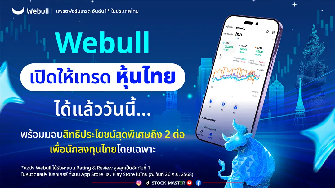 สำหรับผู้ลงทุนที่ต้องการสัมผัสประสบการณ์การลงทุนระดับสูง หรือต้องการเข้าถึงการลงทุนแบบครบทุกมิติ ผ่านฟีเชอร์สุดพิเศษต่าง ๆ ที่ถูกออกแบบมาเพื่อนักลงทุนไทย สำหรับการเทรดหุ้นสหรัฐฯ หุ้นไทย กองทุน ETFs หรือสัญญาออปชัน ก็สามารถดาวน์โหลดแอปพลิเคชัน Webull Thailand เพื่อเข้าถึงแพลตฟอร์มการลงทุนระดับโลกได้แล้ววันนี้ ทั้งบน App Store และ Play Store โดยศึกษาข้อมูลเพิ่มเติมได้ที่เว็บไซต์ www.webull.co.th และเพจ www.facebook.com/WebullThai