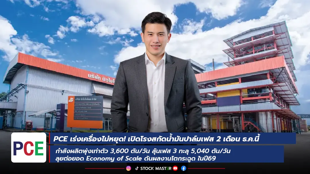 บมจ.เพชรศรีวิชัย เอ็นเตอร์ไพรส์ (PCE) ส่งสัญญาณโตไม่หยุด เดินหน้าขยายโรงสกัดน้ำมันปาล์มเต็มกำลัง เปิดเฟส 2 เดือนธันวาคมนี้ เพิ่มกำลังผลิต 100% จาก1,800 ตันต่อวันเพิ่มเป็น 3,600 ตัน/วัน ก่อนเดินหน้าสู่เฟส 3 ไตรมาส 3 ปี 69 ดันกำลังผลิตทะลุ 5,040 ตัน/วัน ต่อยอด Economy of Scale หนุนรายได้-กำไรระยะยาวแข็งแรง