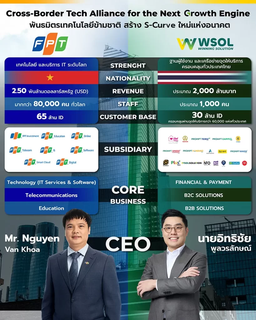ขณะที่ WSOL มีเครือข่ายลูกค้าและจุดเชื่อมต่อบริการที่ครอบคลุมทั่วประเทศ ทั้งระบบชำระเงิน บริการทางการเงิน โครงสร้างร้านค้า รวมถึงพันธมิตรทางธุรกิจในหลายอุตสาหกรรม ส่งผลให้ WSOL ทำหน้าที่เป็น “Go-to-Market Gateway” ที่สำคัญในการขยายโอกาสนำเทคโนโลยีระดับภูมิภาคของ FPT เข้าสู่ตลาดประเทศไทยได้อย่างมีประสิทธิภาพ