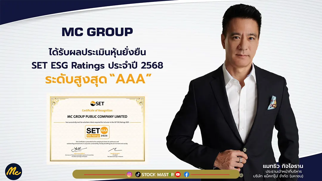 บริษัท แม็คกรุ๊ป จำกัด (มหาชน) หรือ MC ได้รับการประเมิน SET ESG Ratings ประจำปี 2568 ในระดับสูงสุด “AAA” ต่อเนื่องเป็นปีที่ 2 พร้อมได้รับรางวัล Sustainability Award จากตลาดหลักทรัพย์แห่งประเทศไทย