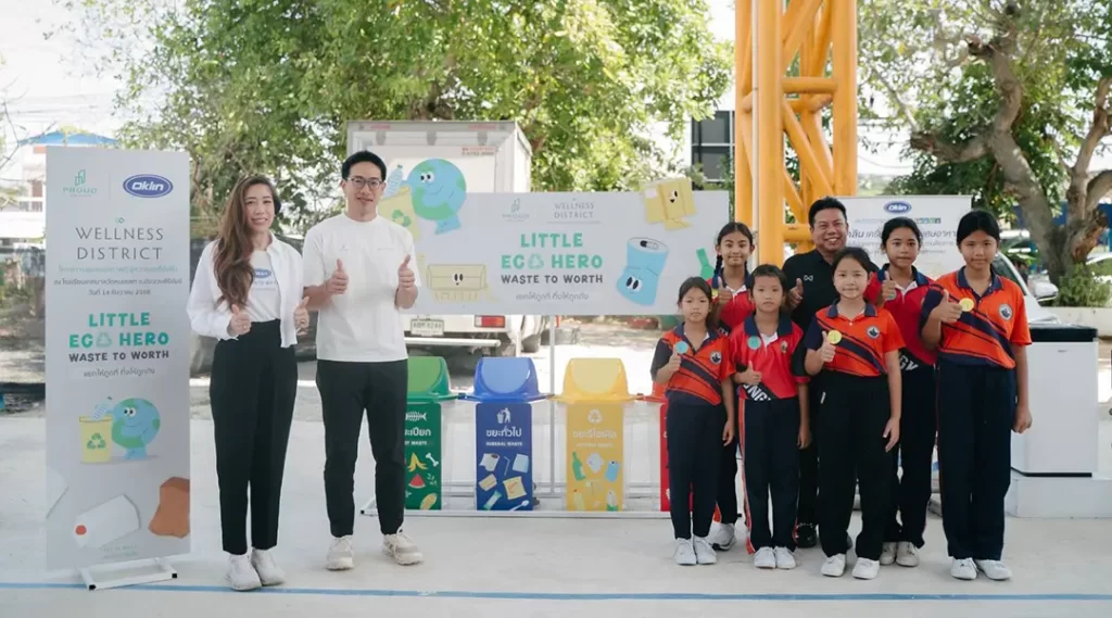 ขณะเดียวกัน บริษัทฯ ยังให้ความสำคัญกับการปลูกฝังจิตสำนึกด้านสิ่งแวดล้อมในระดับเยาวชน ผ่านกิจกรรมให้ความรู้เรื่อง การคัดแยกขยะ แก่นักเรียนโรงเรียนเทศบาลวัดหนองแก โดยความร่วมมือกับ บริษัท โอ๊คลิน (ประเทศไทย) จำกัด แบรนด์ผู้พัฒนาเทคโนโลยีด้านสิ่งแวดล้อมและระบบจัดการเศษอาหารแบบครบวงจร เพื่อสร้างความเข้าใจเรื่องการจัดการขยะตั้งแต่ต้นทาง และส่งเสริมพฤติกรรมการคัดแยกอย่างถูกต้องภายในชุมชน ทั้งนี้ ได้มอบถังขยะสำหรับแยกขยะให้แก่โรงเรียนจำนวน 2 ชุด เพื่อสนับสนุนการจัดการขยะอย่างเป็นระบบ และต่อยอดการเรียนรู้สู่การปฏิบัติจริงในชีวิตประจำวัน ควบคู่กับกิจกรรมส่งเสริมสุขภาพ ผ่านการฝึกศิลปะป้องกันตัวเทควันโดโดยเดอะเลเจ้นท์ อารีน่า เพื่อเสริมสร้างความแข็งแรงของร่างกาย