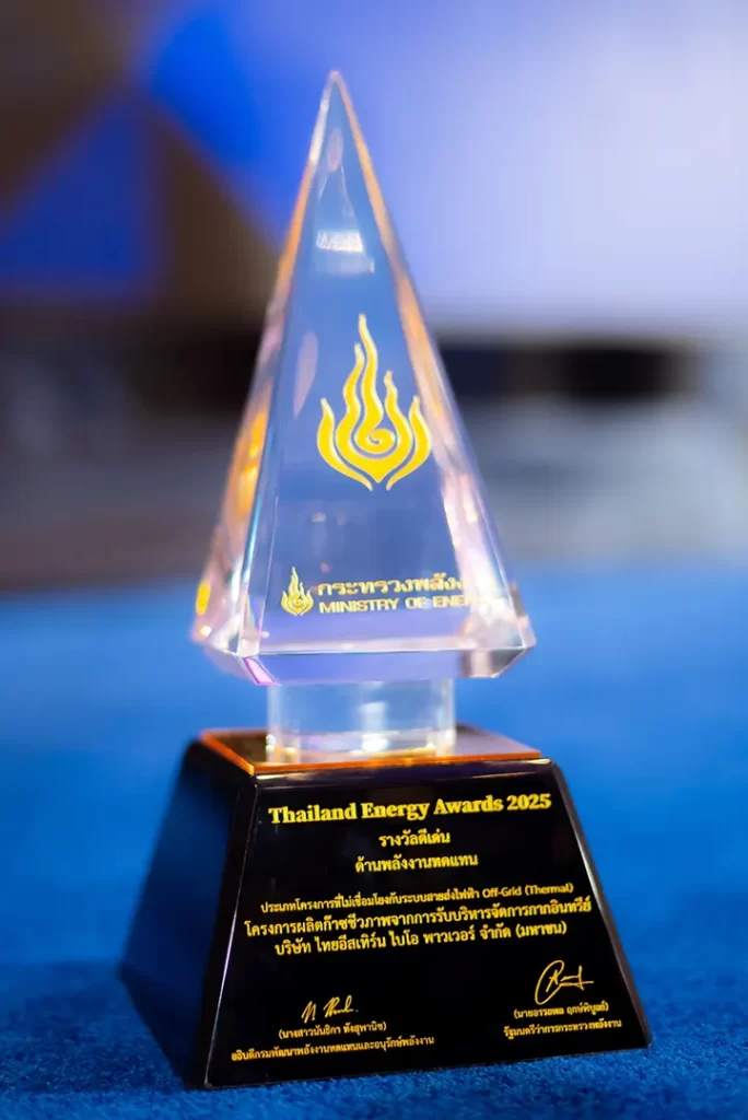 ด้านพลังงานทดแทน ประเภทผลิตความร้อนจากพลังงานทดแทน (Off-Frid; Thermal) จากโครงการ “ผลิตก๊าซชีวภาพจากการรับบริหารจัดการกากอินทรีย์” โดยมี นายอรรถพล ฤกษ์พิบูลย์ รัฐมนตรีว่าการกระทรวงพลังงาน ให้เกียรติเป็นผู้มอบรางวัล