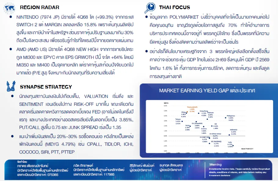 กลยุทธ์การลงทุน: เน้นหุ้นไทยปันผลสูง-รับกระแสเลือกตั้ง จากความผันผวนของตลาดโลก ฝ่ายวิจัยแนะนำให้นักลงทุนเพิ่มสัดส่วนการถือเงินสดในพอร์ตเป็น 20%–30% เพื่อรอจังหวะซื้อเมื่อตลาดย่อตัว, โดยมองว่าตลาดหุ้นไทยมีความน่าสนใจในฐานะแหล่งพักเงิน เนื่องจากมีส่วนต่างผลตอบแทน (MEYG) สูงถึง 4.79%