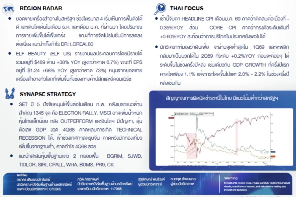 3. เลี่ยง Technical Recession: คาดการณ์ตัวเลข GDP งวดไตรมาส 4/68 (ประกาศ 16 ก.พ.) จะกลับมาขยายตัว +0.2% QoQ และ +1.3% YoY รอดพ้นจากภาวะถดถอยทางเทคนิค