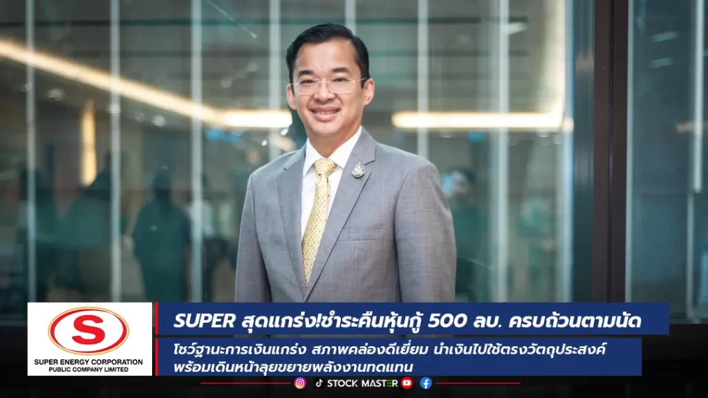 บมจ.ซุปเปอร์ เอนเนอร์ยี คอร์เปอเรชั่น (SUPER) ตอกย้ำศักยภาพทางการเงิน ชำระคืนหุ้นกู้รุ่น SUPER 262A มูลค่า 500 ล้านบาท พร้อมดอกเบี้ย ครบถ้วนตามกำหนด สะท้อนโครงสร้างการเงินแข็งแกร่ง สภาพคล่องมีประสิทธิภาพ สร้างความเชื่อมั่นนักลงทุนต่อเนื่อง