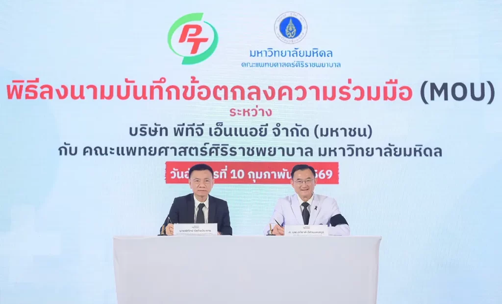 นายพิทักษ์ รัชกิจประการ ประธานเจ้าหน้าที่บริหารและกรรมการผู้จัดการใหญ่ บริษัท พีทีจี เอ็นเนอยี จำกัด (มหาชน) หรือ PTG ร่วมลงนามบันทึกข้อตกลงความร่วมมือ (MOU) กับศาสตราจารย์นายแพทย์อภิชาติ อัศวมงคลกุล คณบดีคณะแพทยศาสตร์ศิริราชพยาบาล มหาวิทยาลัยมหิดล