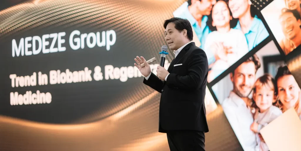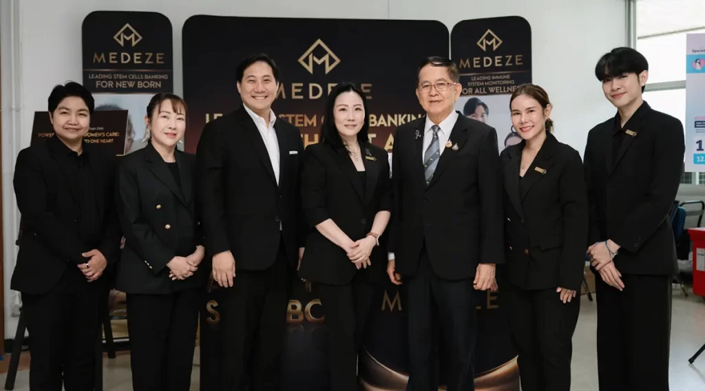 นายแพทย์วีรพล เขมะรังสรรค์ ประธานเจ้าหน้าที่บริหาร นางสาวดนิตา พิทักษ์เนติกุล ประธานเจ้าหน้าที่สายพัฒนาธุรกิจ บริษัท เมดีซ กรุ๊ป จำกัด (มหาชน) หรือ MEDEZE ร่วมออกบูธนำเสนอข้อมูลผลิตภัณฑ์และบริการด้านสเต็มเซลล์ Biobank และนวัตกรรมทางการแพทย์ขั้นสูง