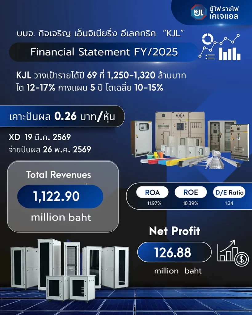ขณะที่ผลประกอบการสำหรับปี 2568 บริษัทมีกำไรสุทธิอยู่ที่ 126.88 ล้านบาท และมีรายได้รวมอยู่ที่ 1,122.90 ล้านบาท โดยรายได้ส่วนใหญ่ของบริษัทฯ ยังคงมาจากรายได้จากการขายสินค้ามาตรฐานเคเจแอล
