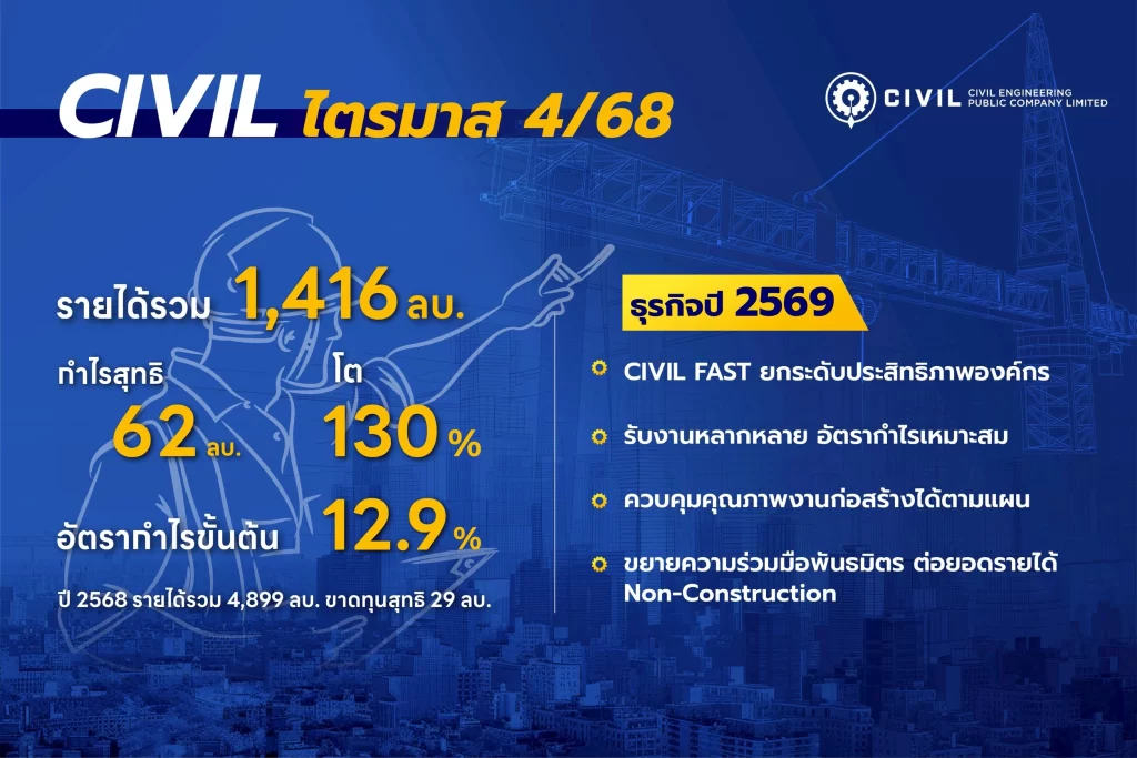 CIVIL เผยผลประกอบการไตรมาส 4/68 รายได้รวม 1,416 ล้านบาท กำไรสุทธิ 62 ล้านบาท โต 130% กลยุทธ์ FAST ยกระดับองค์กร ดันส่งมอบ 22 โครงการ มูลค่า 2,599 ล้านบาท เดินหน้าแผนรับงานส่งมอบเร็ว เพิ่มประสิทธิภาพการดำเนินงาน บริหารต้นทุนรัดกุม รักษาเสถียรภาพธุรกิจ