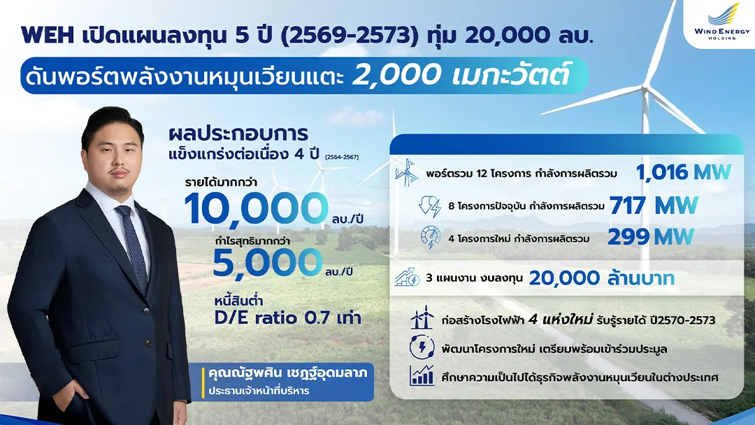 “วินด์ เอนเนอร์ยี่ โฮลดิ้ง” เตรียมงบลงทุน 5 ปี ระหว่างปี 2569 – 2573 รวม 20,000 ล้านบาท เดินหน้า 3 แผนงาน มุ่งบรรลุเป้าขยายพอร์ตไฟฟ้าพลังงานหมุนเวียนสู่ 2,000 เมกะวัตต์ มั่นใจกลางปี 2569 นี้ เริ่มปักหมุดก่อสร้าง โรงไฟฟ้าพลังงานลมโครงการใหม่ 89.7 เมกะวัตต์ ที่ อ.เทพารักษ์ จ.นครราชสีมา