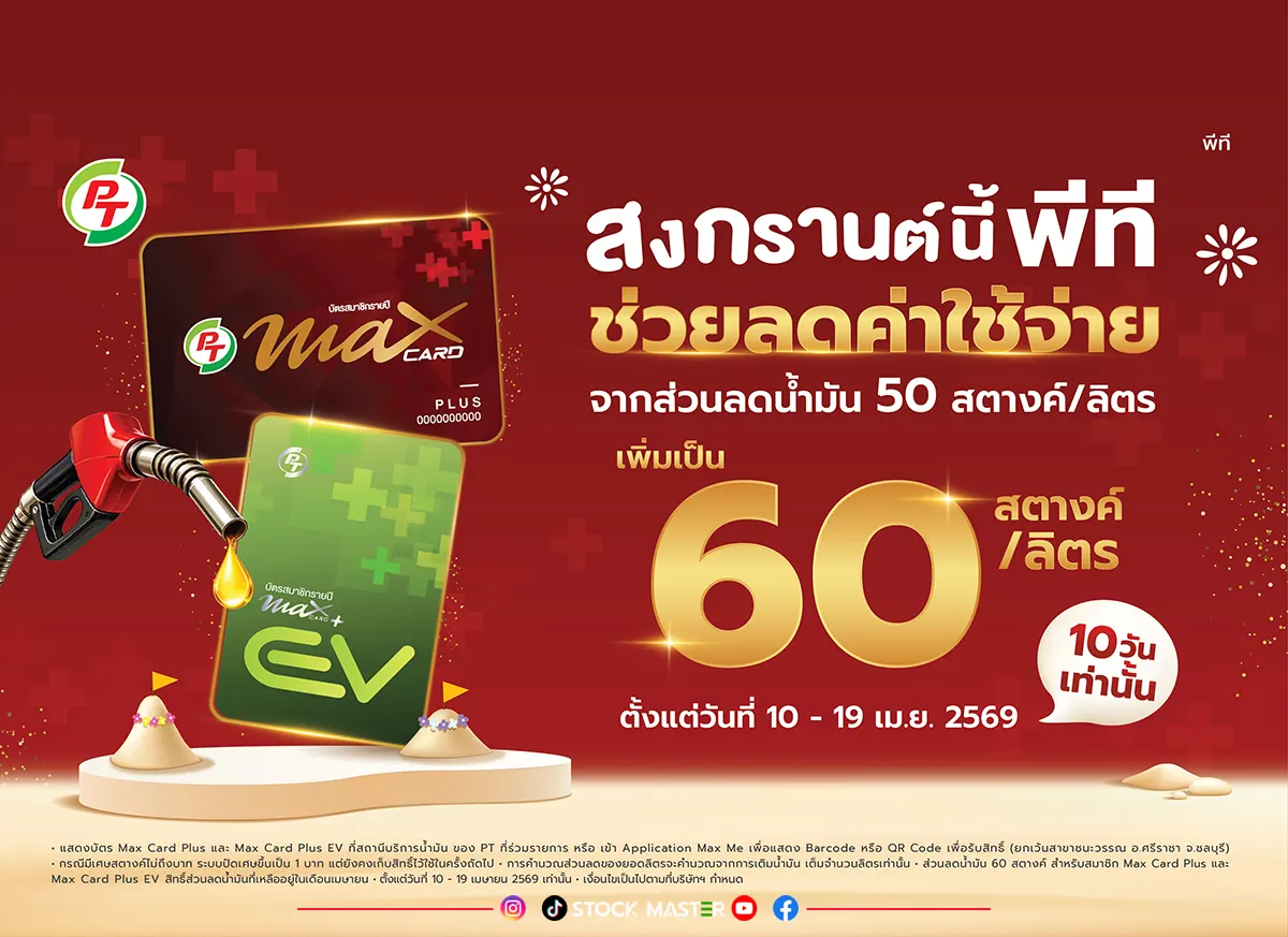 ***เพียงแสดงบัตร Max Card และ Max Card Plus EV ที่สถานีบริการน้ำมันของ PT ที่ร่วมรายการ หรือ เข้า Application Max Me เพื่อแสดง Barcode หรือ QR Code เพื่อรับสิทธิ ***เริ่มตั้งแต่วันที่ 10 – 19 เมษายน 2569 นี้เท่านั้น (เงื่อนไขเป็นไปตามที่บริษัทฯ ที่กำหนด)