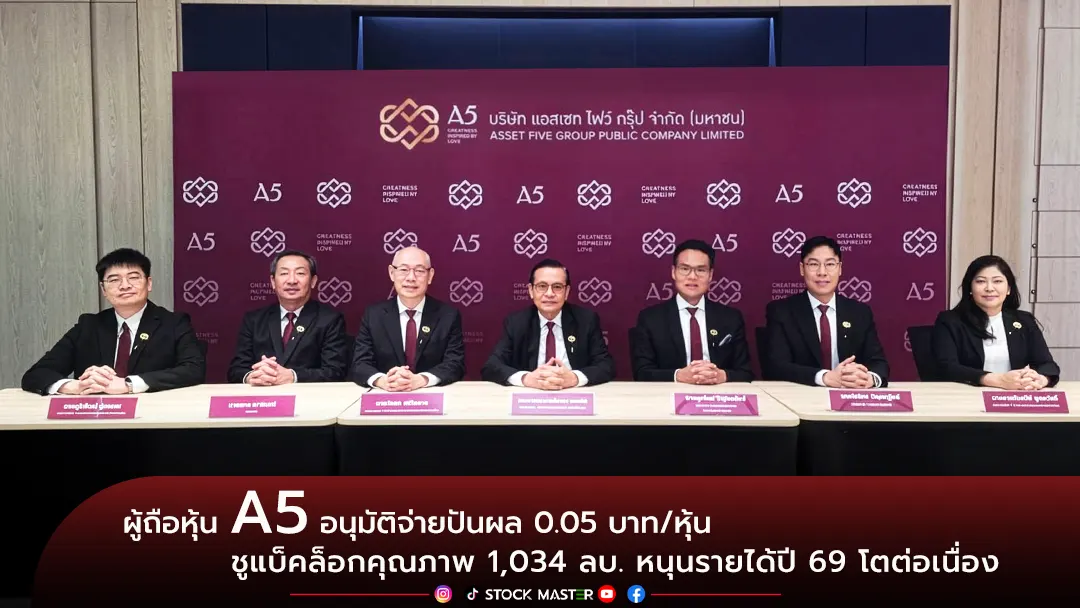 A5 จัดงานประชุมสามัญผู้ถือหุ้นประจำปี 69 มีมติอนุมัติจ่ายปันผล 0.05 บาท/หุ้น Record Date 12 มี.ค. 69 กำหนดจ่ายปันผล 14 พ.ค. 69 สะท้อนความแข็งแกร่งของกระแสเงินสดและความสามารถในการทำกำไรอย่างต่อเนื่องจากพอร์ตโครงการระดับลักชัวรีที่ได้รับการตอบรับอย่างดี พร้อมชูแบ็คล็อกคุณภาพกว่า 1,034 ล้านบาท หนุนรายได้ปี 69 โตต่อเนื่อง