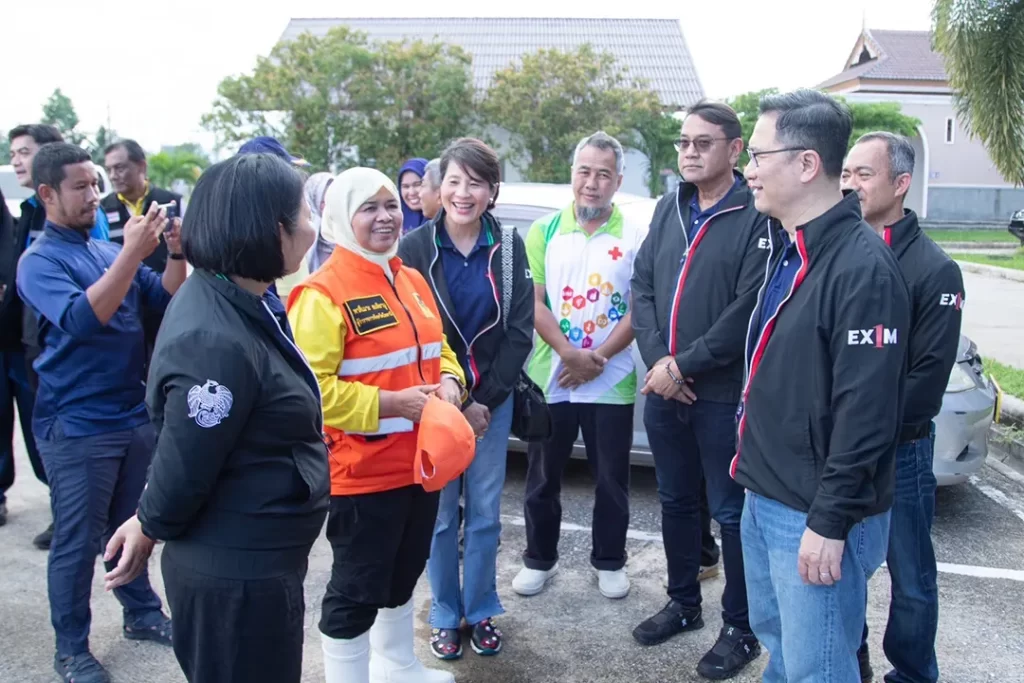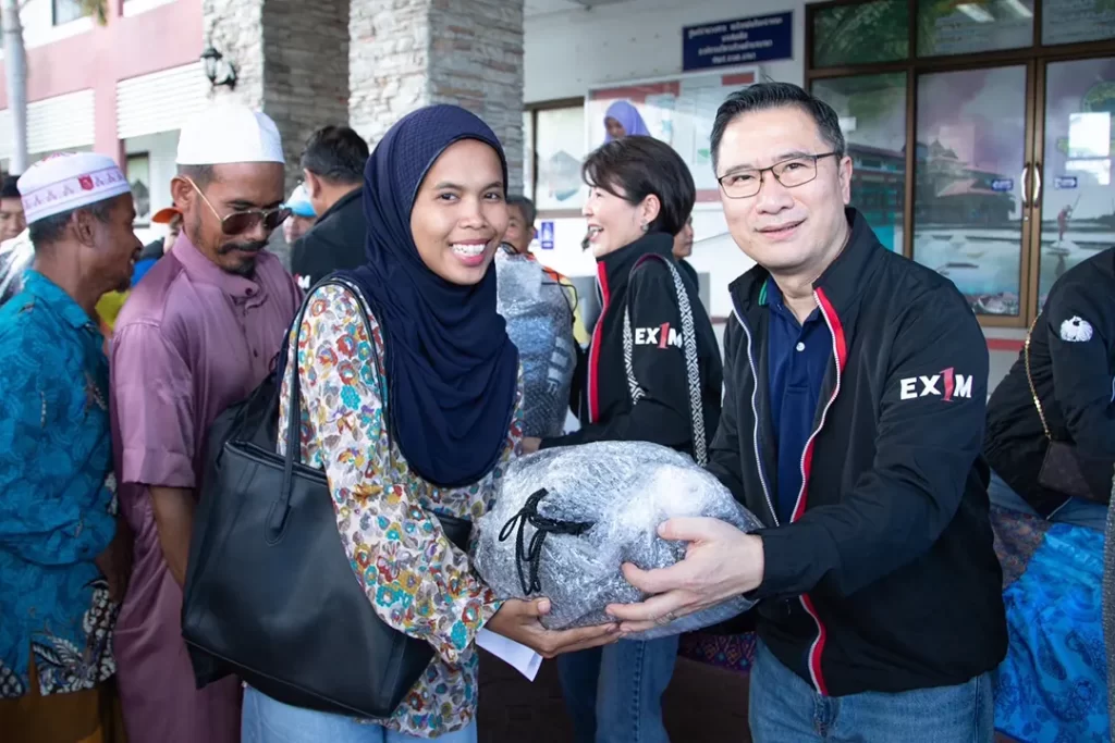 นางสาวดรัสวันต์ ชูวงษ์ และนายชลัช รัตนบุญนิธิ ผู้ช่วยกรรมการผู้จัดการ ธนาคารเพื่อการส่งออกและนำเข้าแห่งประเทศไทย (EXIM BANK) พร้อมด้วยผู้บริหารและพนักงาน EXIM BANK มอบถุงยังชีพ ประกอบด้วย เครื่องอุปโภคบริโภค ข้าวสาร อาหารแห้ง และน้ำดื่ม เพื่อบรรเทาความเดือดร้อนของผู้ประสบอุทกภัยในพื้นที่จังหวัดปัตตานี โดยมีนางพาตีเมาะ สะดียามู ผู้ว่าราชการจังหวัดปัตตานี เป็นผู้รับมอบ ณ องค์การบริหารส่วนตำบลบานา อำเภอเมือง จังหวัดปัตตานี เมื่อวันที่ 6 ธันวาคม 2567