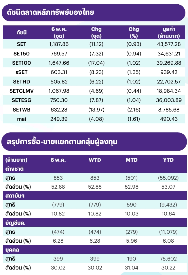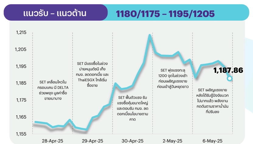 ติดตามการแถลงของธนาคารกลางจีน PBOC ตลาดคาดหวังเครื่องมือการเงินใหม่ และมาตรการกระตุ้นด้านเทคโนโลยี การค้าภายในประเทศและการบริโภคเพื่อชดเชยผลกระทบจากการส่งออก ทิศทางตลาดที่ผ่านมามีช่วงชะลอตัวลง + พักฐานมา 2 วัน เริ่มมีโอกาสชะลอการปรับตัวลง หรือ ดีดกลับสั้นได้ ประเมินแนวรับอยู่ที่ 1180 และ 1175 จุด ขณะที่แนวต้านอยู่ที่ 1195 และ 1205 จุด