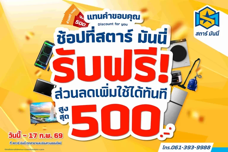 บมจ.สตาร์ มันนี่ (STARM) เดินเกมรุกไม่มียั้ง! ล่าสุดจัดแคมเปญขอบคุณลูกค้า มอบส่วนลดสูงสุดทันที 500 บาท เมื่อซื้อเครื่องใช้ไฟฟ้าตามเงื่อนไข