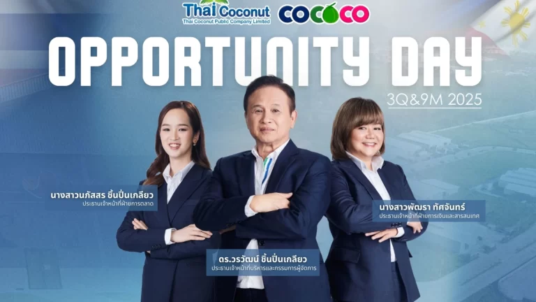 บมจ. ไทย โคโคนัท หรือ COCOCO ร่วมงาน OppDay ให้ข้อมูลธุรกิจ-เปิดกลยุทธ์เติบโตระยะยาว รับอานิสงส์สหรัฐฯ ยกเว้นภาษีนำเข้าซึ่งรวมหมวดที่เกี่ยวข้องกับอุตสาหกรรมมะพร้าว ด้าน CEO ระบุโครงการฟิลิปปินส์ – การเพิ่มเฟสโรงงานกระเทาะมะพร้าวคาดจะเปิดดำเนินงาน ไตรมาส 3/2569 พร้อมตอกย้ำผู้นำผลิต-ส่งออกน้ำมะพร้าวรายใหญ่ของไทย สู่ 100 ประเทศทั่วโลก