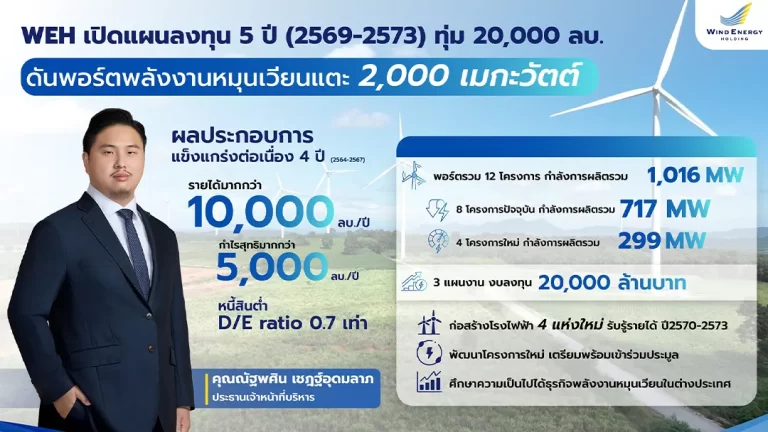 “วินด์ เอนเนอร์ยี่ โฮลดิ้ง” เตรียมงบลงทุน 5 ปี ระหว่างปี 2569 – 2573 รวม 20,000 ล้านบาท เดินหน้า 3 แผนงาน มุ่งบรรลุเป้าขยายพอร์ตไฟฟ้าพลังงานหมุนเวียนสู่ 2,000 เมกะวัตต์ มั่นใจกลางปี 2569 นี้ เริ่มปักหมุดก่อสร้าง โรงไฟฟ้าพลังงานลมโครงการใหม่ 89.7 เมกะวัตต์ ที่ อ.เทพารักษ์ จ.นครราชสีมา