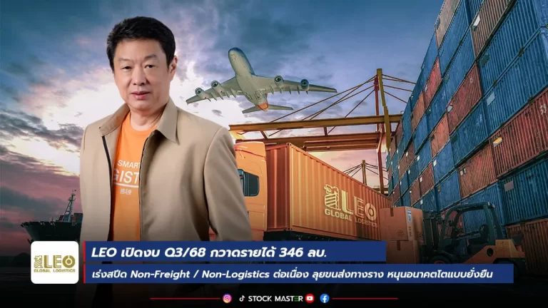 บมจ.ลีโอ โกลบอล โลจิสติกส์ (LEO) เปิดงบไตรมาส 3/68 รายได้รวมแตะ 346 ล้านบาท ฟากซีอีโอ“เกตติวิทย์ สิทธิสุนทรวงศ์” ส่งสัญญาณแนวโน้มผลงานโค้งสุดท้ายโตแกร่ง หลังภาษีนำเข้าสหรัฐชัดเจน เร่งสปีดธุรกิจ Non Freight และ Non-Logistics ต่อเนื่อง เดินหน้าลุยธุรกิจขนส่งทางราง ผลักดันอนาคตเติบโตอย่างมั่นคงและยั่งยืน